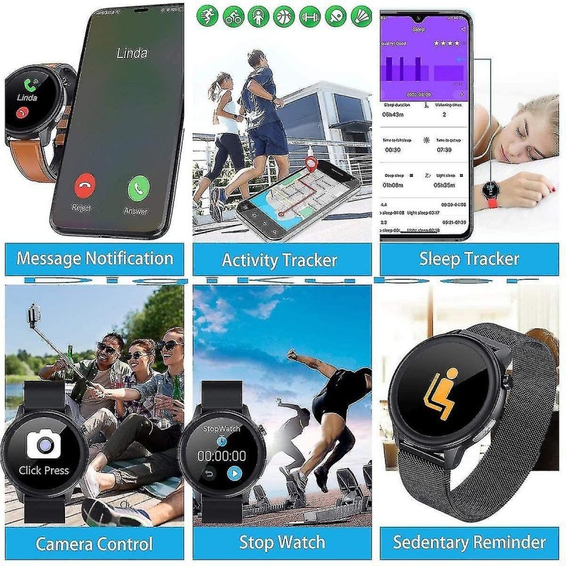 DIFFÉRENTES FONCTIONS telles que l'affichage de l'heure et de la date, l'affichage de la météo, la notification d'appel et de message, le compteur de pas, l'enregistrement de la consommation de calories, l'enregistrement du kilométrage sportif, 7 modes sportifs, moniteur de fréquence cardiaque, diagnostic ECG / PPG / Ai, contrôle de la caméra, moniteur de sommeil, rappel de sédentarité, chronomètre, entraînement respiratoire.MONITEUR DE TEMPÉRATURE CORPORELLE 24 HEURES Vous pouvez mesurer votre température corporelle pendant 24 heures, les données de température corporelle peuvent être enregistrées dans l'application [SmartHealth], vous pouvez surveiller votre température corporelle et surveiller votre santé à tout moment.GESTION DU SPORT ET DE LA SANTÉ Suivi de la mesure de plusieurs données sportives et de santé : mode multisport, podomètre, distance, calories ; Diagnostic ECG / PPG / AI / moniteur de fréquence cardiaque. Faites attention à votre santé tout le temps. Les données de sport et de santé de la montre intelligente sont uniquement à titre de référence, veuillez écouter les conseils du médecin.MONITEUR DE SOMMEIL ET AFFICHAGE MÉTÉO Fonction de surveillance du sommeil : lorsque vous vous endormez, la montre intelligente calcule automatiquement la qualité de votre sommeil, synchronise les données avec l'application. Vous pouvez connaître la qualité du sommeil. La fonction d'affichage météo affichera les informations météorologiques actuelles et la qualité de l'air. (Remarque : vous devez obtenir les informations de localisation de votre téléphone pour afficher la météo).IP68 IMPERMÉABLE ET CHARGE MAGNÉTIQUE IP68 a d'excellentes performances d'étanchéité et peut répondre à la plupart des besoins quotidiens. (Remarque : ne pas tremper dans l'eau profonde pendant une longue période. Ne le portez pas non plus dans les sources chaudes et les bains chauds.) Chargement par aspiration magnétique, le temps de charge est d'environ 3 à 4 heures, le temps d'utilisation est d'environ 5 à 13 jours, en veille 20 à 40 jours.